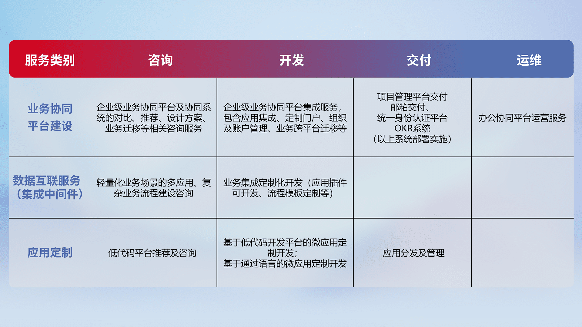 针对钉钉、、、、企微、、、、IDaas等平台级产品提供产品的规划、、、方案、、、交付、、、、定制化开发等服务,,实现如统一协同办公、、、智能客户服务、、、、混合会议管理、、、智能数据查询、、等业务场景,,,实现数字化转型。。。。