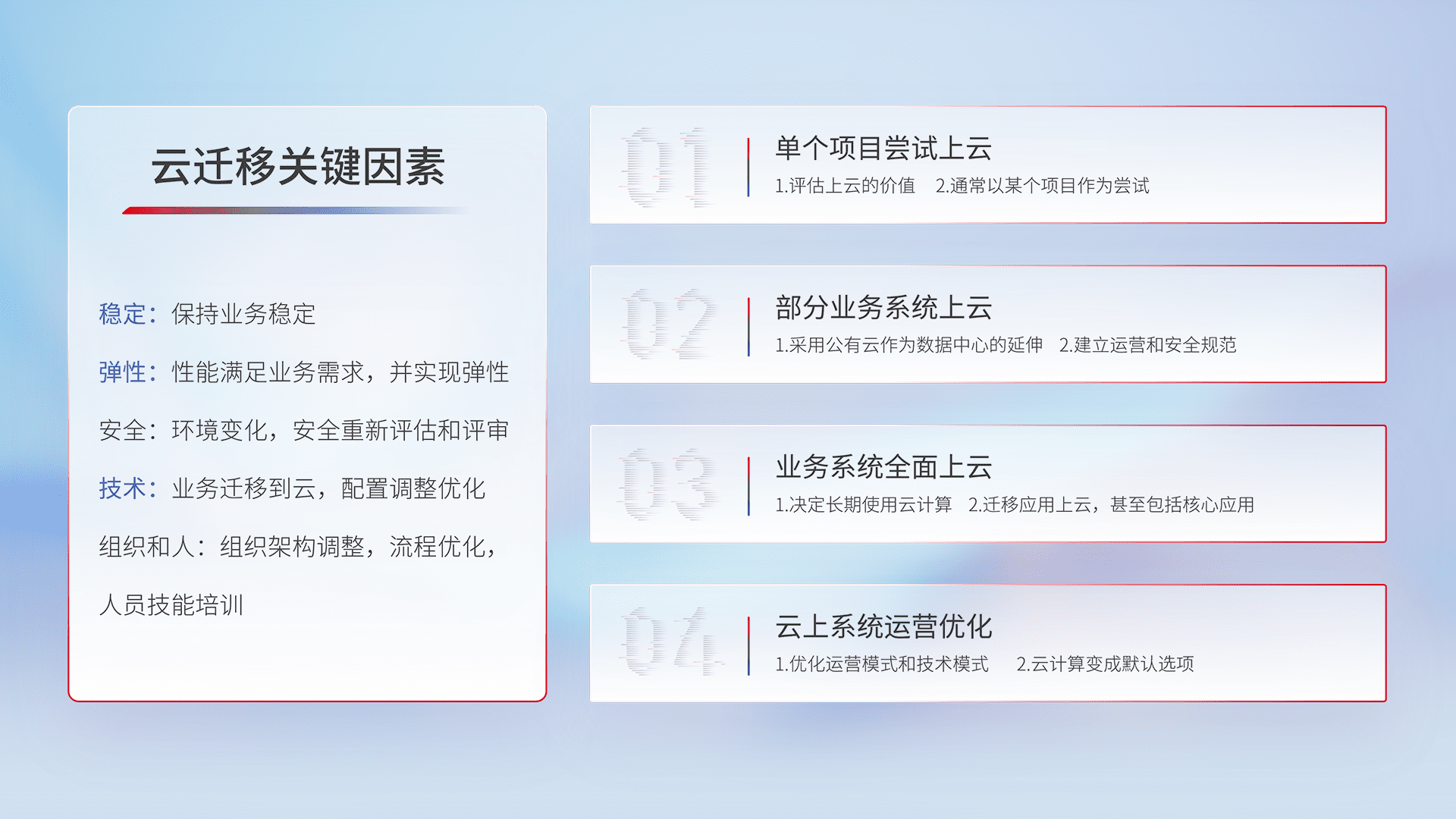结合实际业务,,,,从规划设计、、、、云平台选型、、、、云原生改造、、数据迁移、、、、集成交付,,,迁移全过程为客户识别最佳上云路径,,,,做好风险识别管理,,设计网络架构、、身份权限、、安全审计合规、、操作审计、、、、日志审计、、、监控告警策略、、、多站点容灾设计等,,,对云上基础设施进行整体规划,,,提升IT治理水平,,,,以满足弹性、、、高可用、、、、高性能的需求。。。