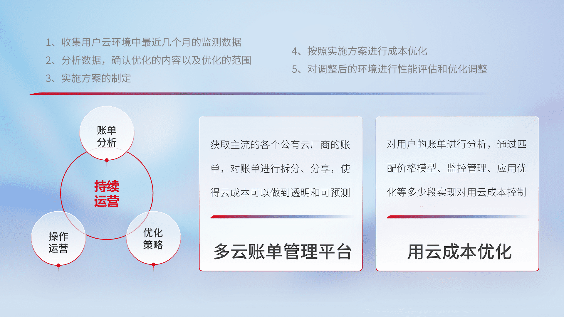 通过多云纳管,,以统一的资源数据模型把客户的云资源进行抽象和封装,,,进而实现对多云资源的统一操作,,,,保障云资源管理的可靠性、、、稳定性与可用性。。。量身定制化运维内容,,配置、、、、开发运维、、、、补丁管理、、备份、、、、监控、、、认证和访问管理、、审计和日常巡检等,,,,保障在用云过程中的可靠度,,,,稳定度以及高可用率。。。