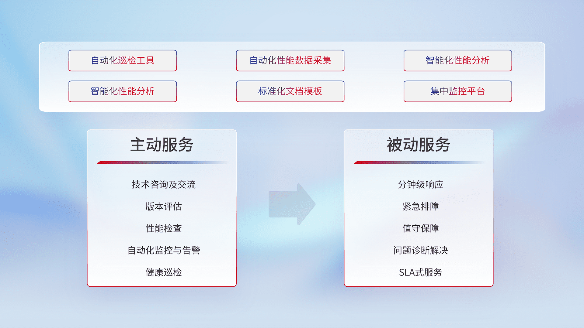 智能化工具和标准化文档,,,保障服务质量,,,,提供主动服务(包含技术咨询、、、、版本评估、、性能检查、、、自动化监控与告警、、健康巡检)和被动服务包含(分钟级响应、、紧急排障、、、、值守保障、、、、问题诊断解决、、、、SLA服务)。。